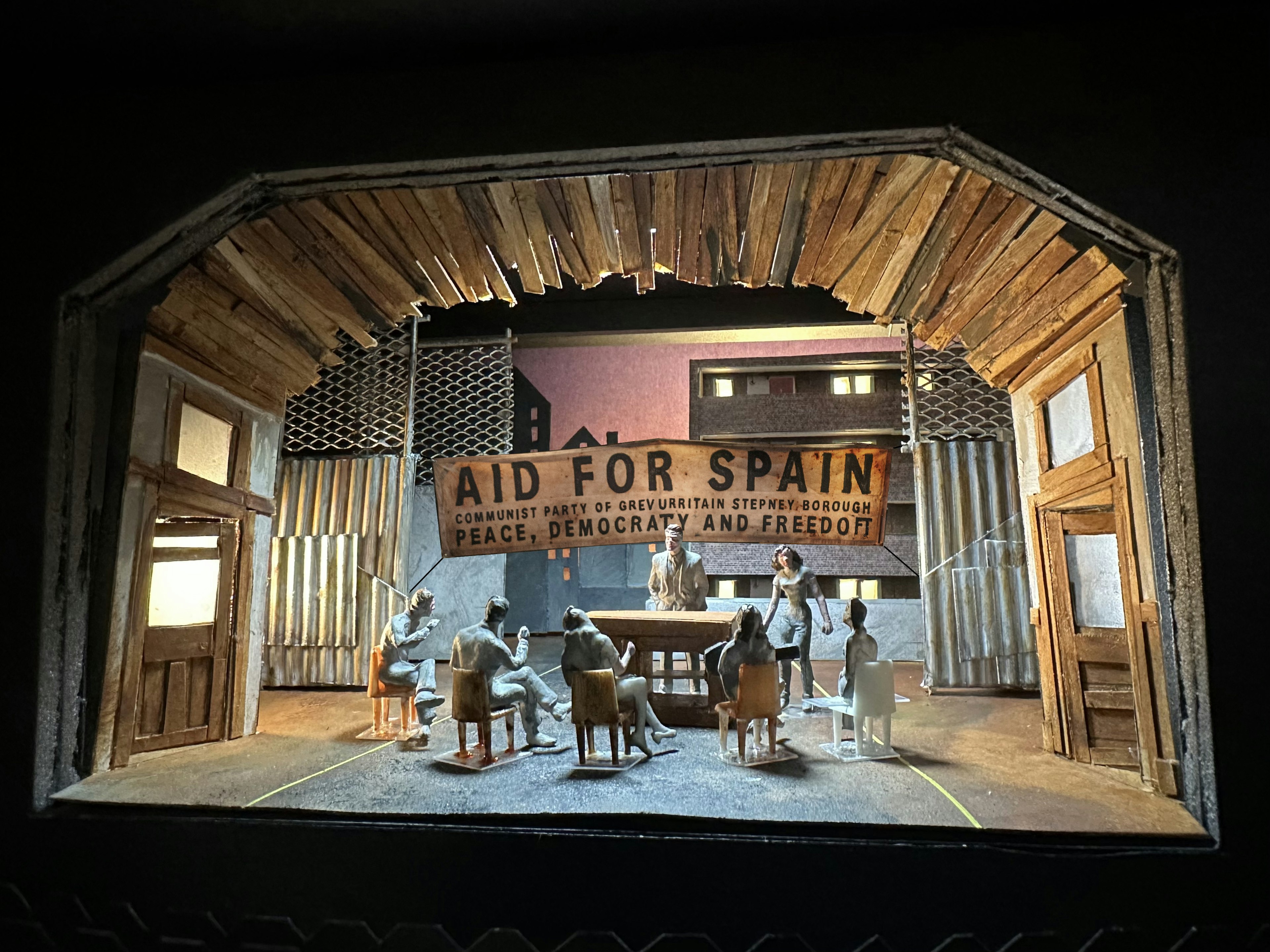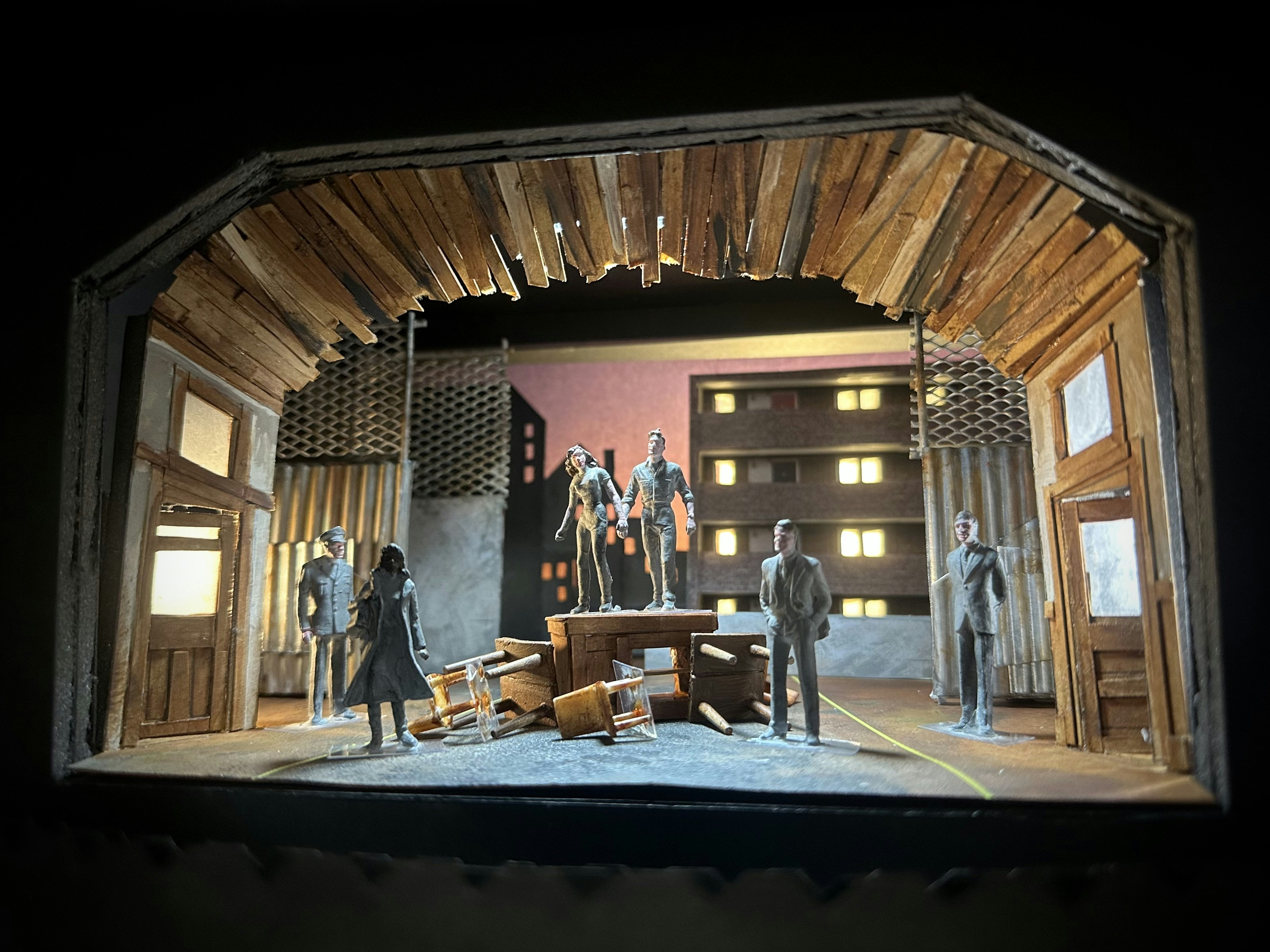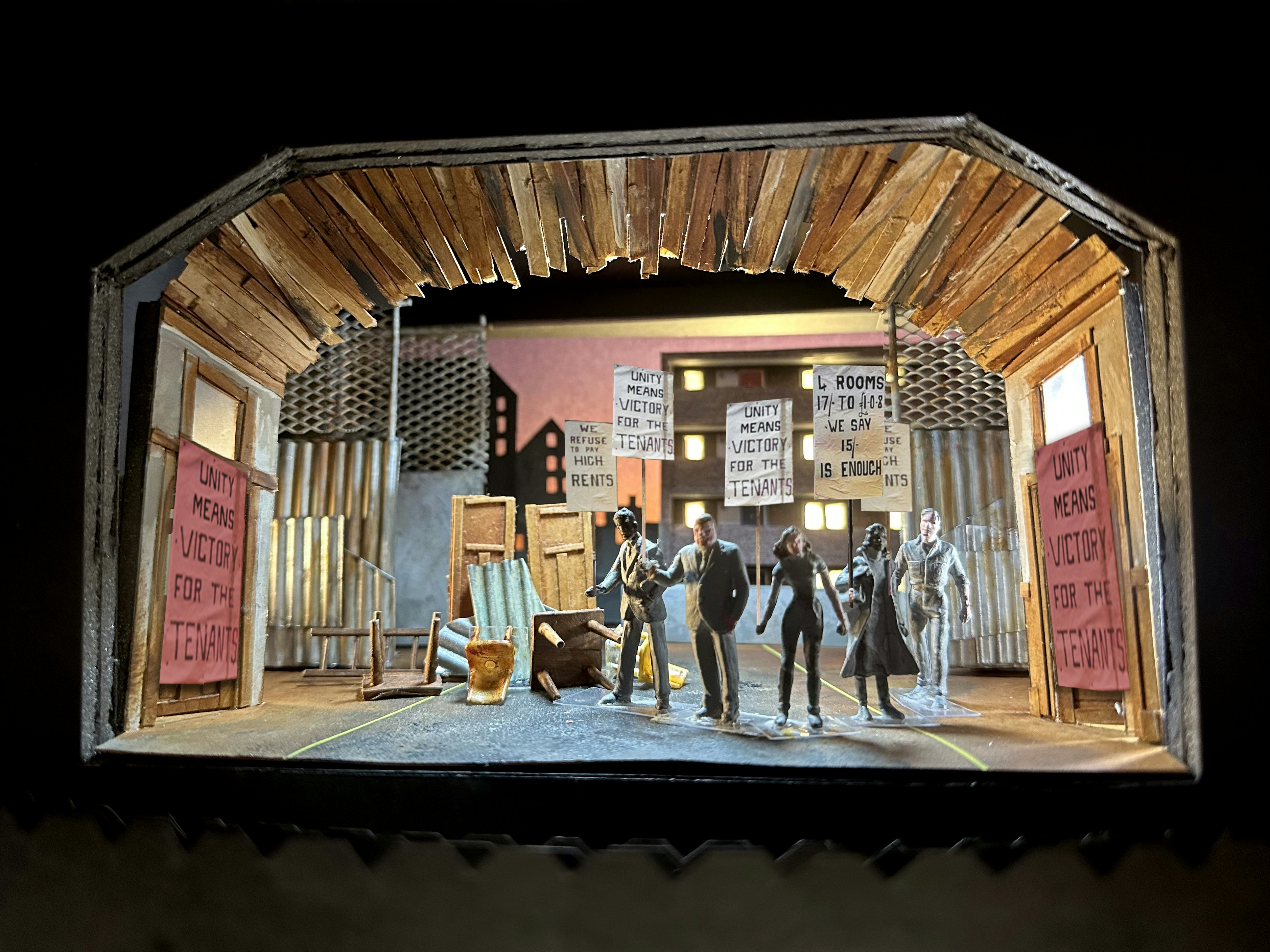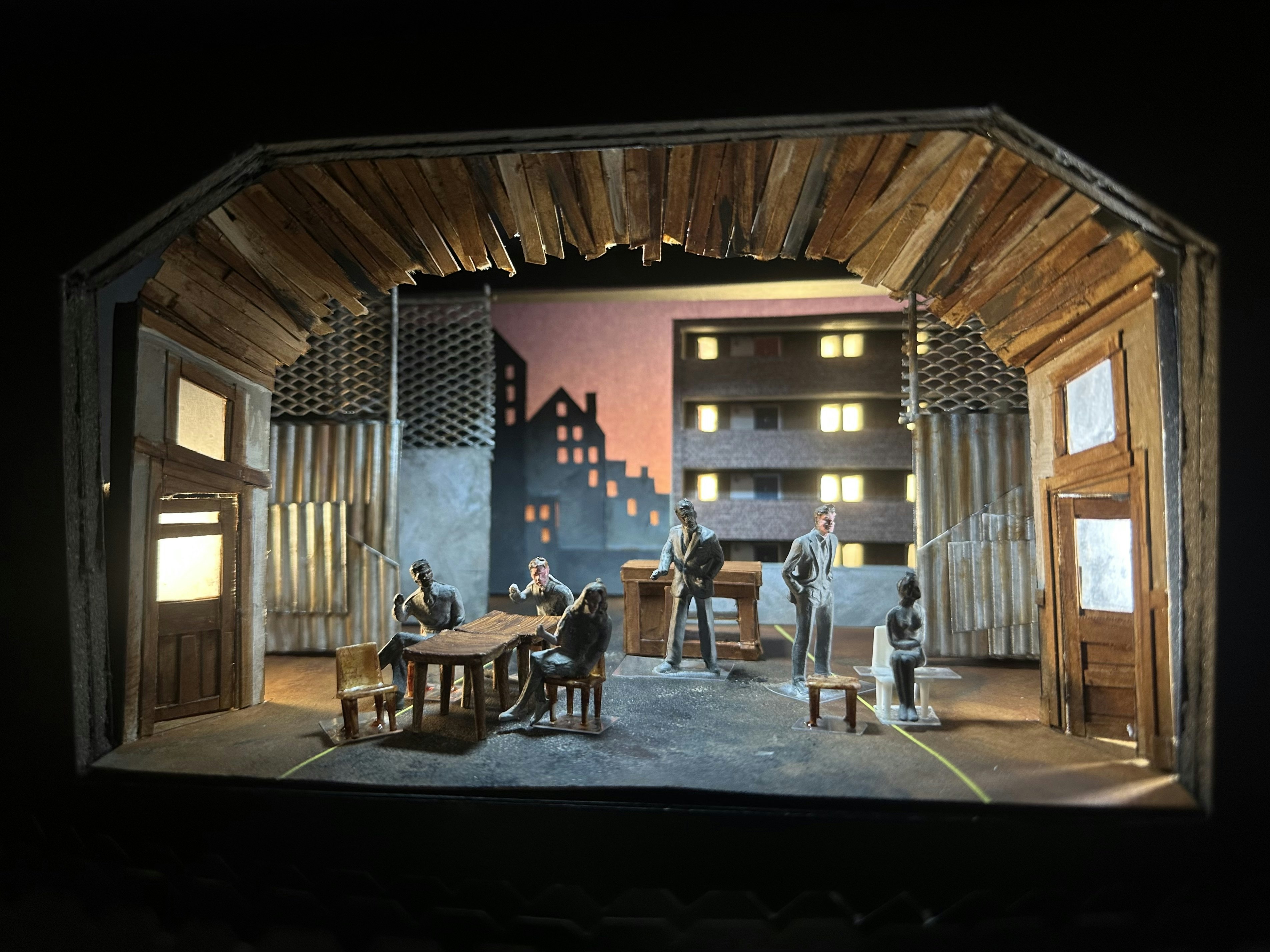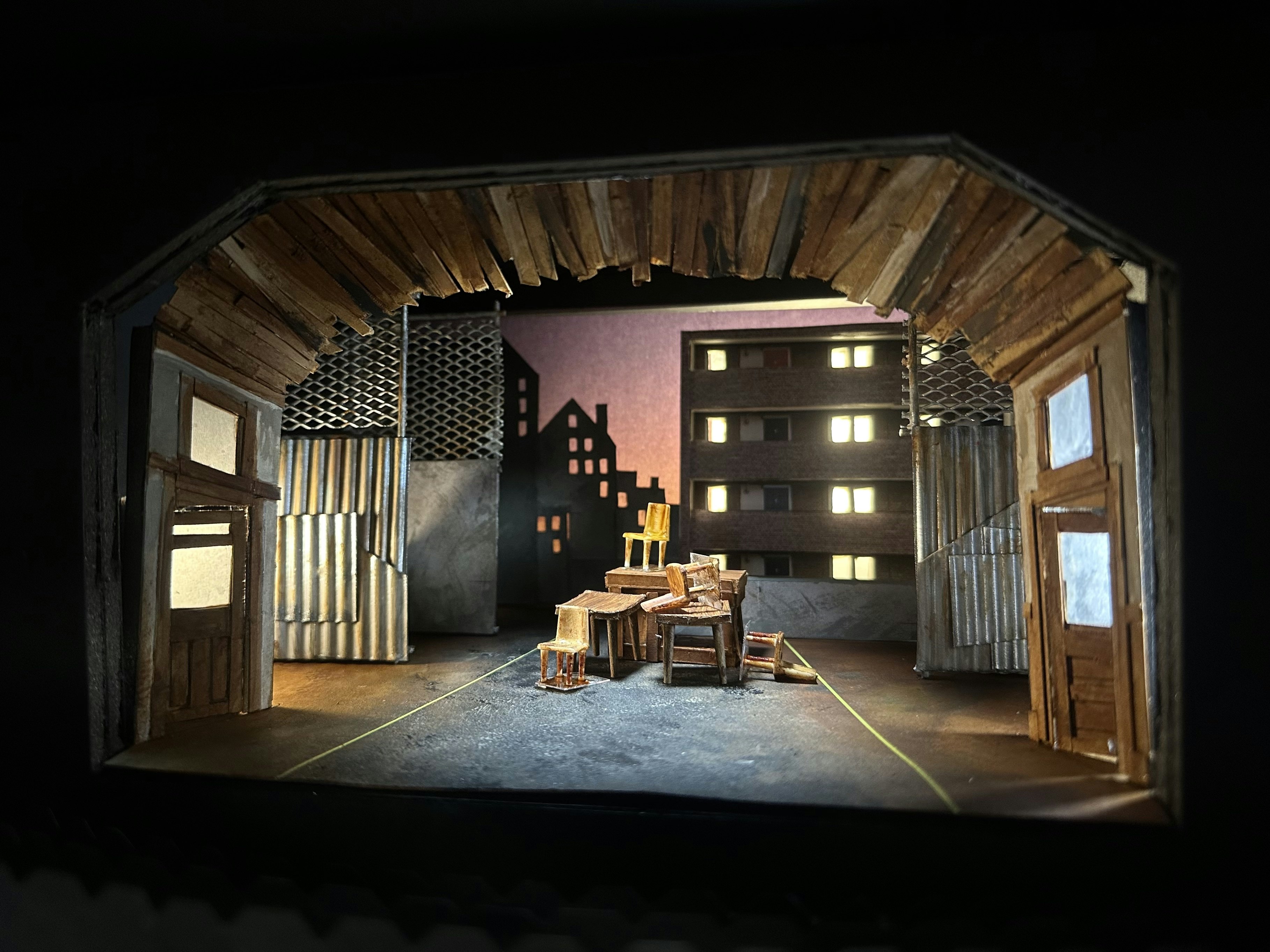 CABLE STREET is a production that’s very close to my heart. My grandfather was one of the organisers, and participants, in the demonstration against Mosley so it’s a big part of our family story and identity. Being able to rethink this production for its third outing (!) moving from thrust to a proscenium stage has been a wonderful challenge. The vision for this design was to open out the world with a smashed and broken wood arch, metal portals, the block of flats that our characters are being evicted from present on stage and a distant cityscape of East London behind. Ingredients to paint the many worlds of the narrative with lighting and atmospherics. The front of the stage is a domestic space, ripped open to the outside world, which is invading it with politics and ideology as experienced by our characters in the story. To achieve all this I’ve used old-school false/forced perspective techniques to cheat the eye and make the most of the stage depth and width. Whilst it was in drawings and being built it felt like a risky roll of the dice, so it has been such a joy to see it land.