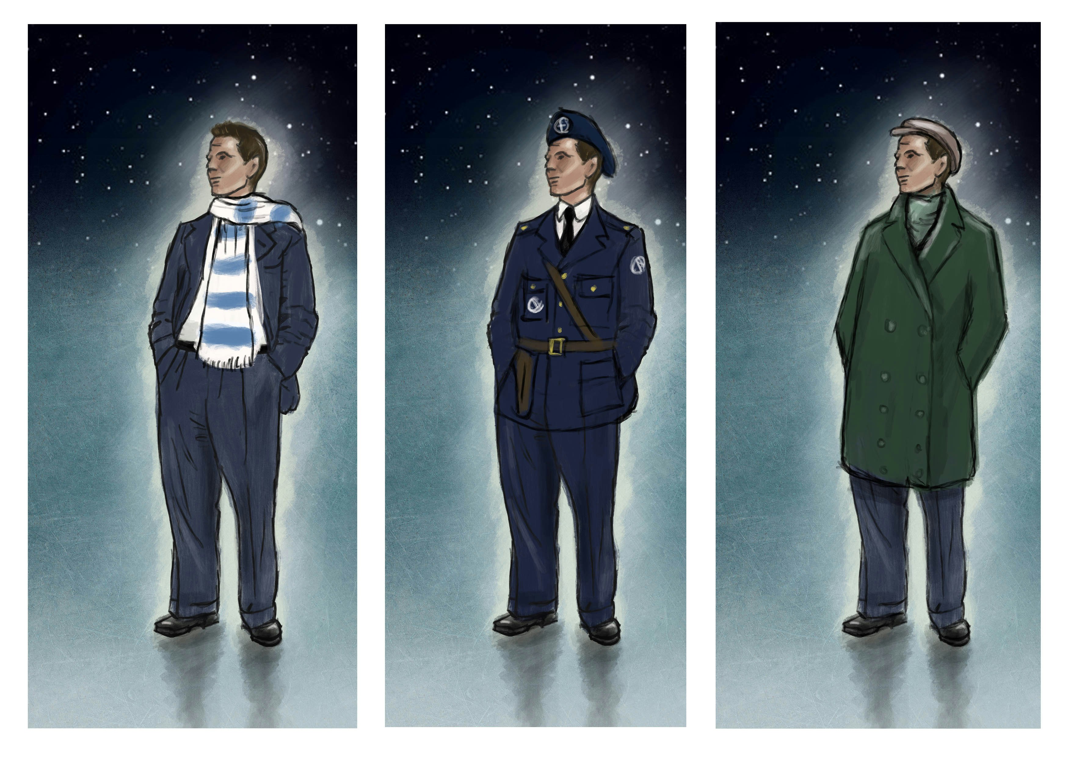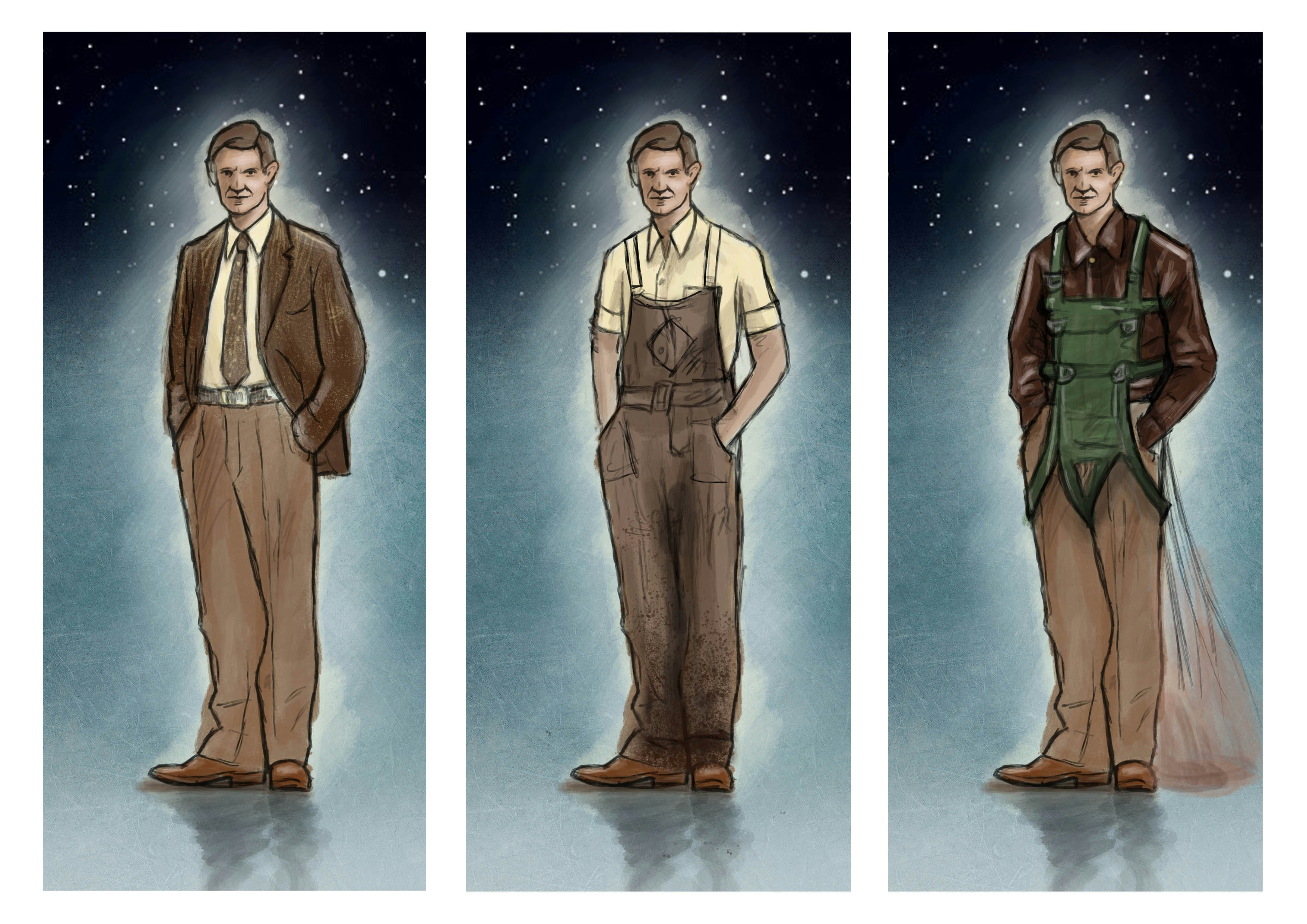 A few of the many costumes drawings. These first three are for Francis in his basic, farmer and parachuting outfits.