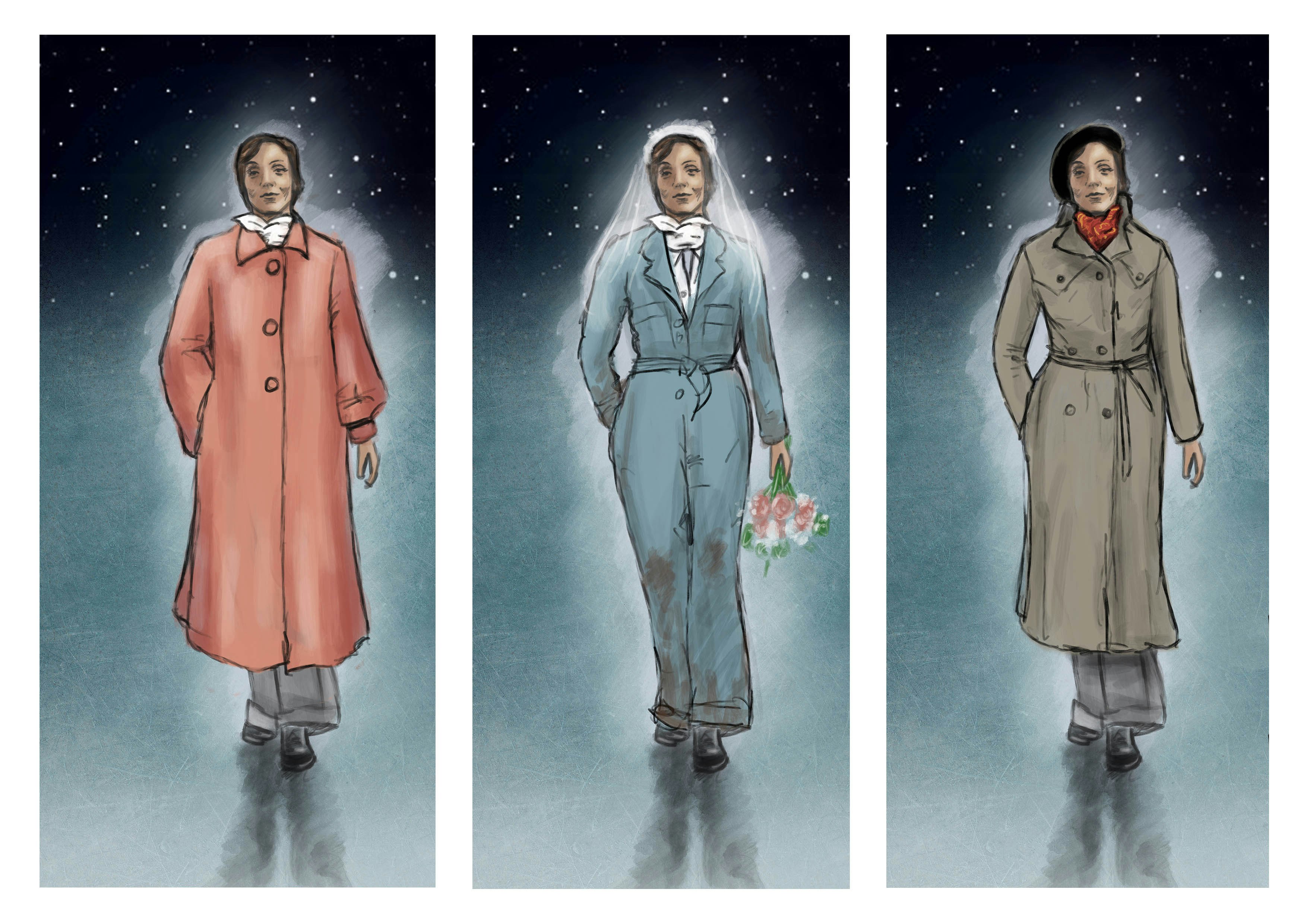 Next are design for Nan in her 1950s swing coat, wedding overalls and the spy Christine.