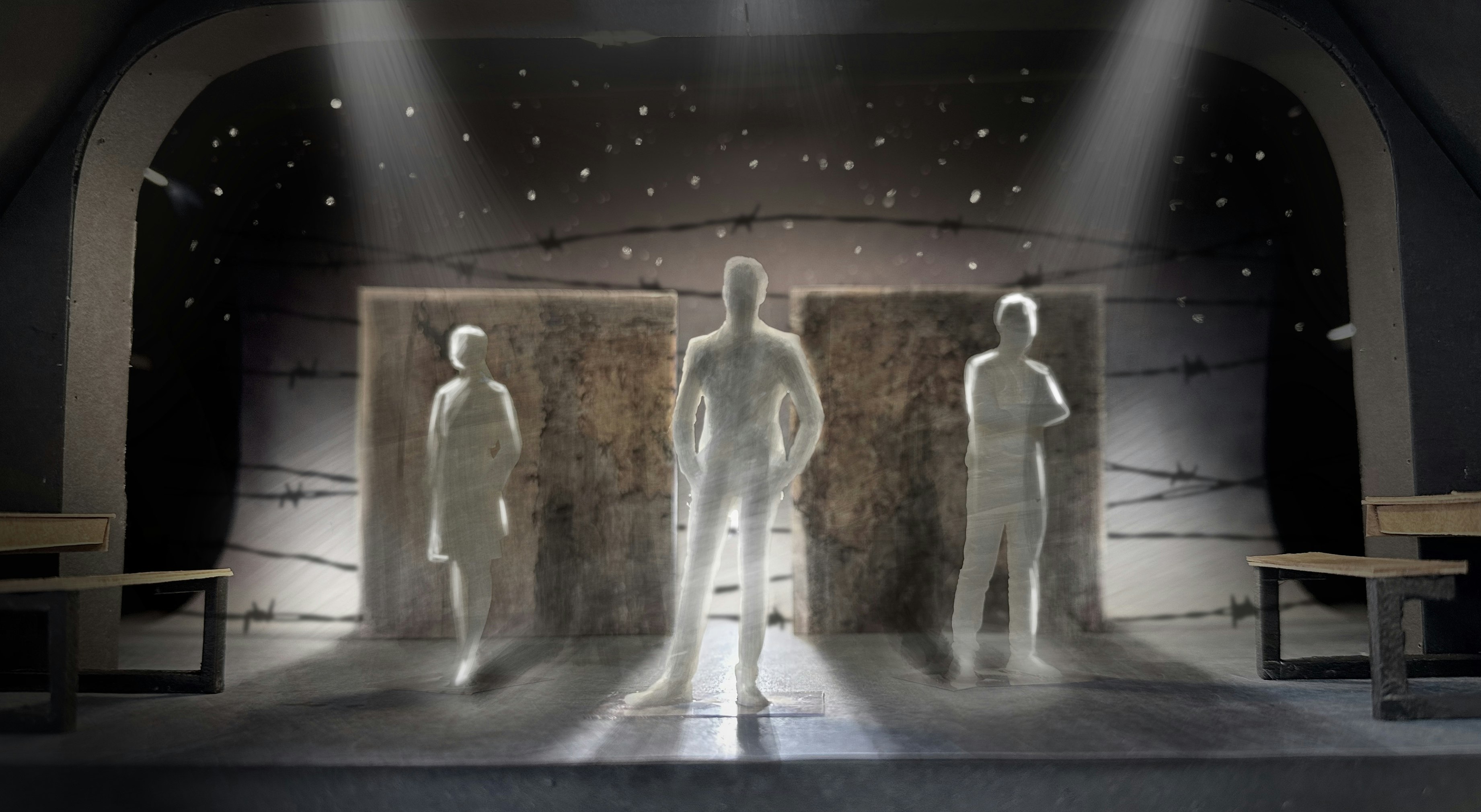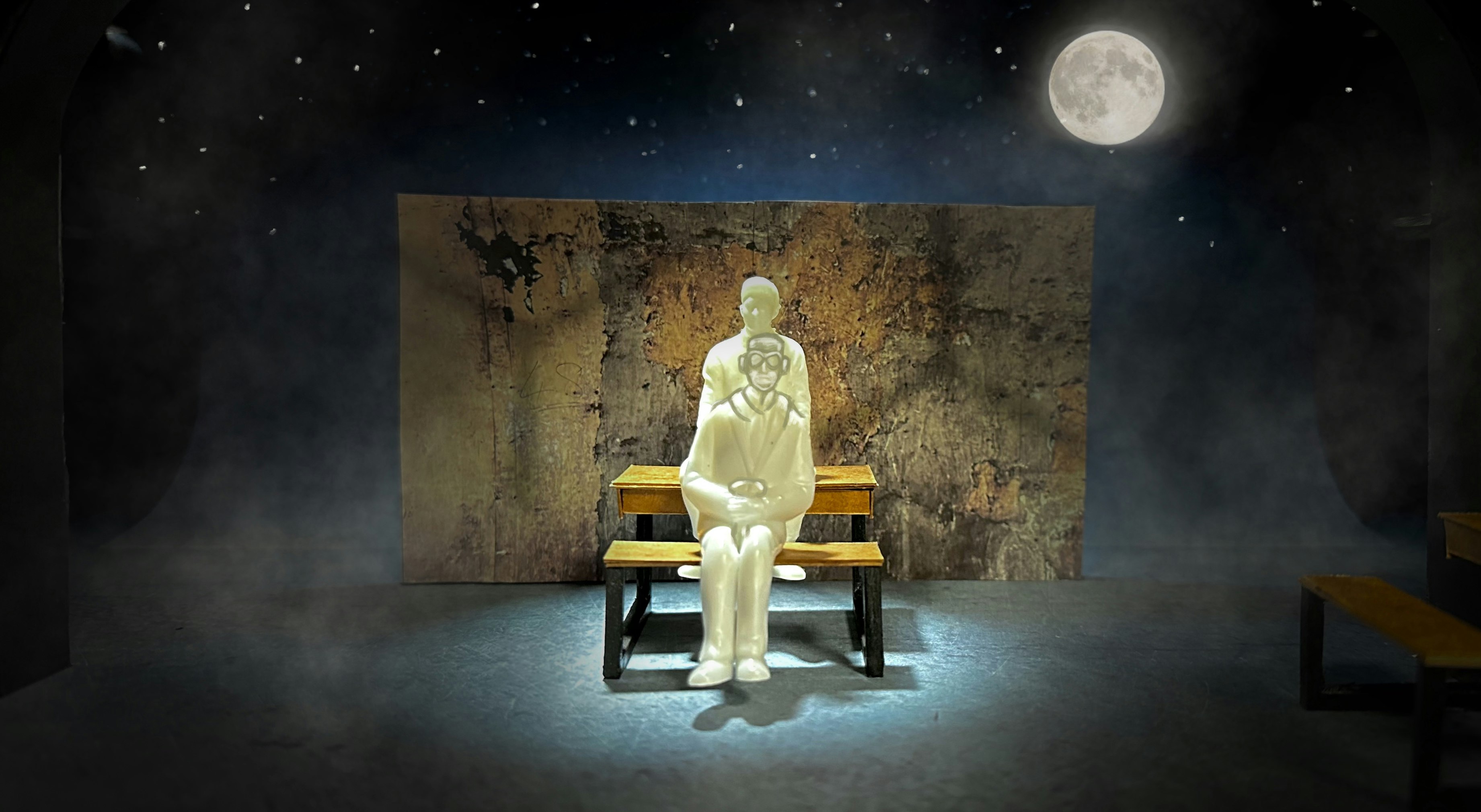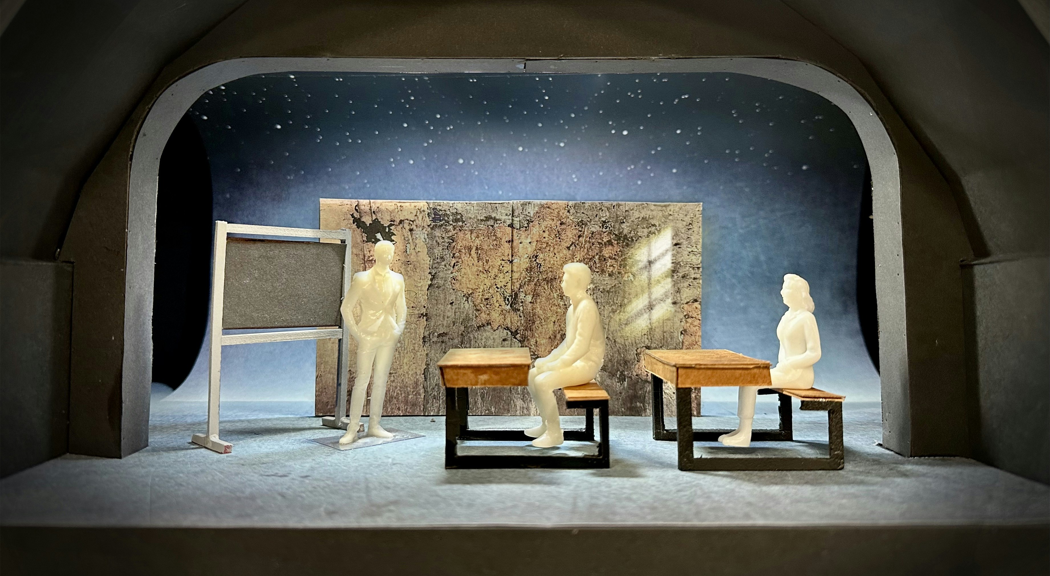 Philip Wilson (the director) and I worked closely to design a scenic concept to conjure up a TV studio, bedroom, burning plane for parachute jump, war-torn resistance France and many other locations across a period of decades. We decided on a cyclorama that could carry landscapes and backlit stars with a monumental, beat-up old wall stood in front of it which opened to create a metaphorical ‘mouth of the wolf’. A visual omen of mortality. Sam and Jess at SAS built and scenic painted these elements beautifully. Ridiculous Solutions made us clever flexible school desks, that could also become the car and plane, and a traditional blackboard. The success of the design was utterly dependent on Ryan Day's exquisite lighting.