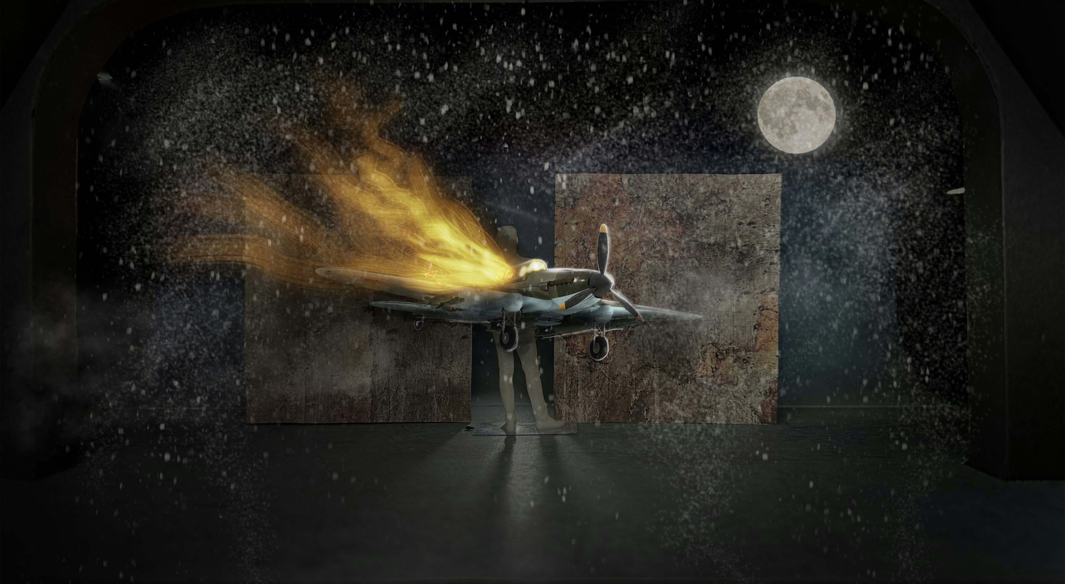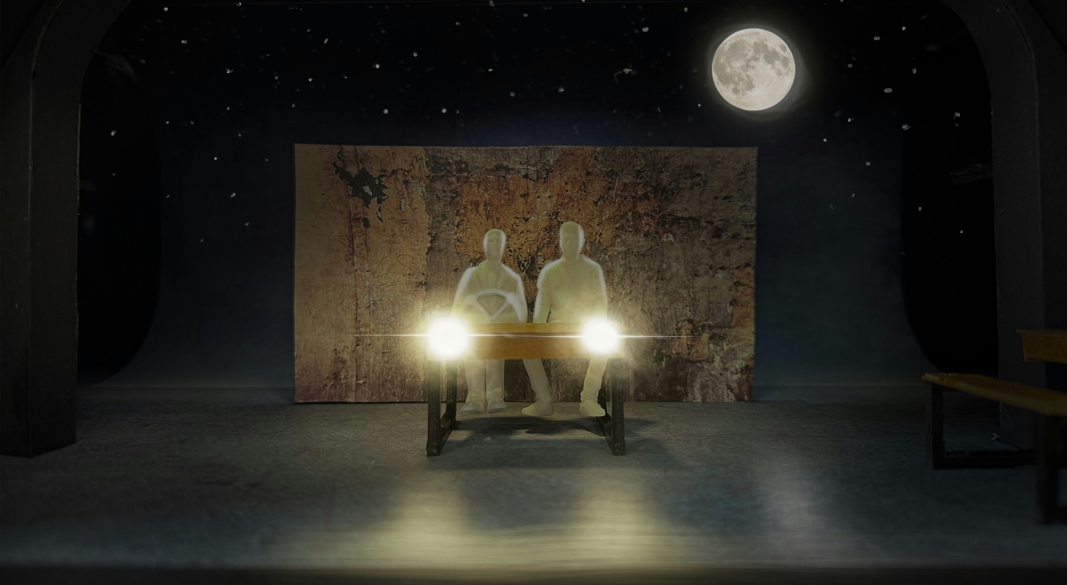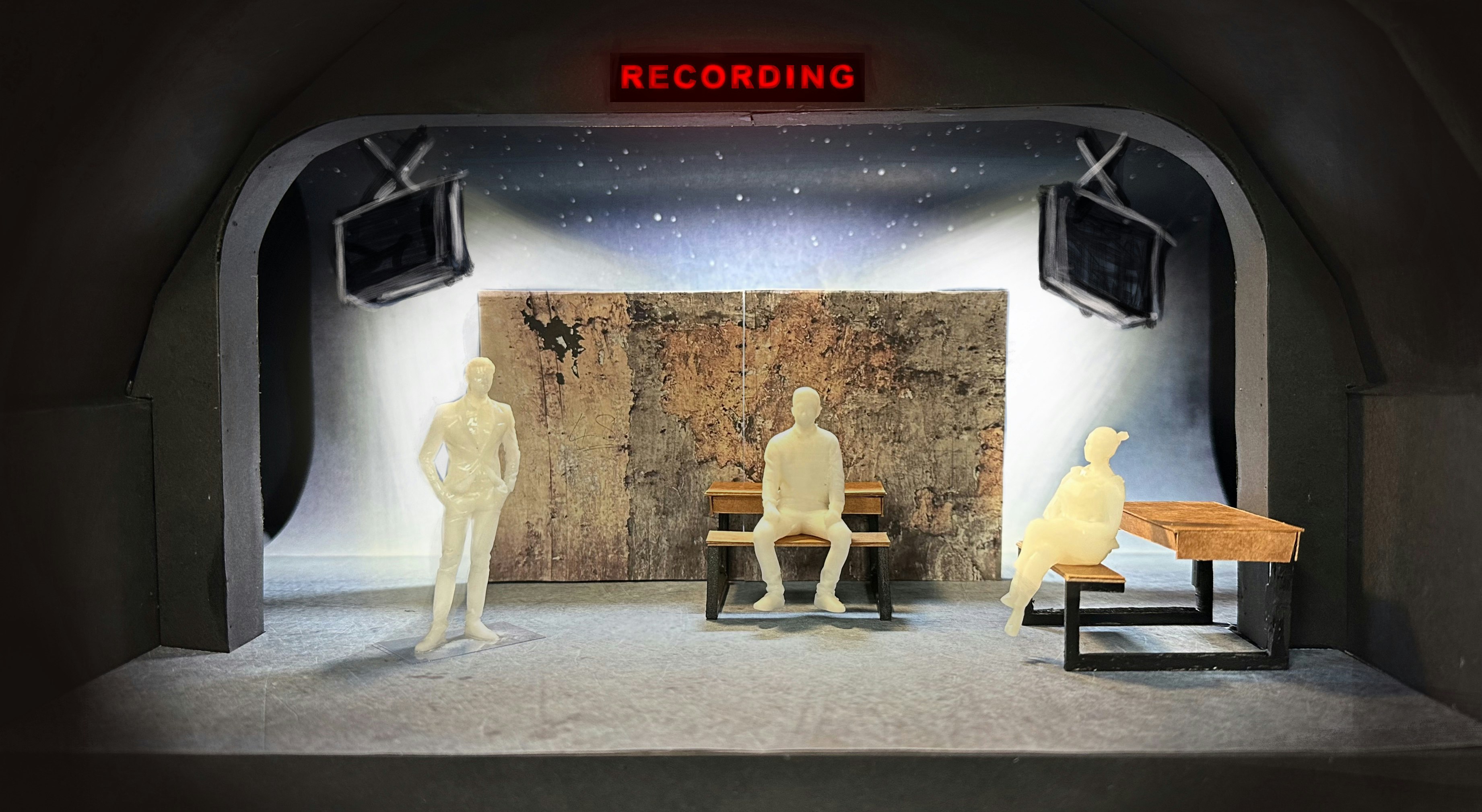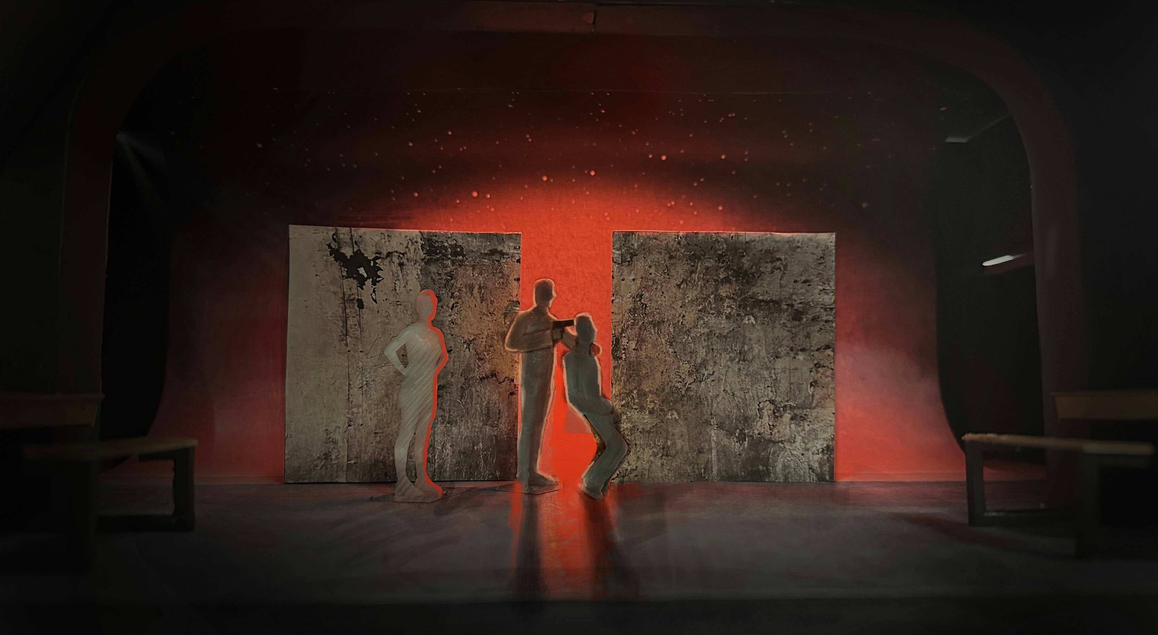 Philip Wilson (the director) and I worked closely to design a scenic concept to conjure up a TV studio, bedroom, burning plane for parachute jump, war-torn resistance France and many other locations across a period of decades. We decided on a cyclorama that could carry landscapes and backlit stars with a monumental, beat-up old wall stood in front of it which opened to create a metaphorical ‘mouth of the wolf’. A visual omen of mortality. Sam and Jess at SAS built and scenic painted these elements beautifully. Ridiculous Solutions made us clever flexible school desks, that could also become the car and plane, and a traditional blackboard. The success of the design was utterly dependent on Ryan Day's exquisite lighting.