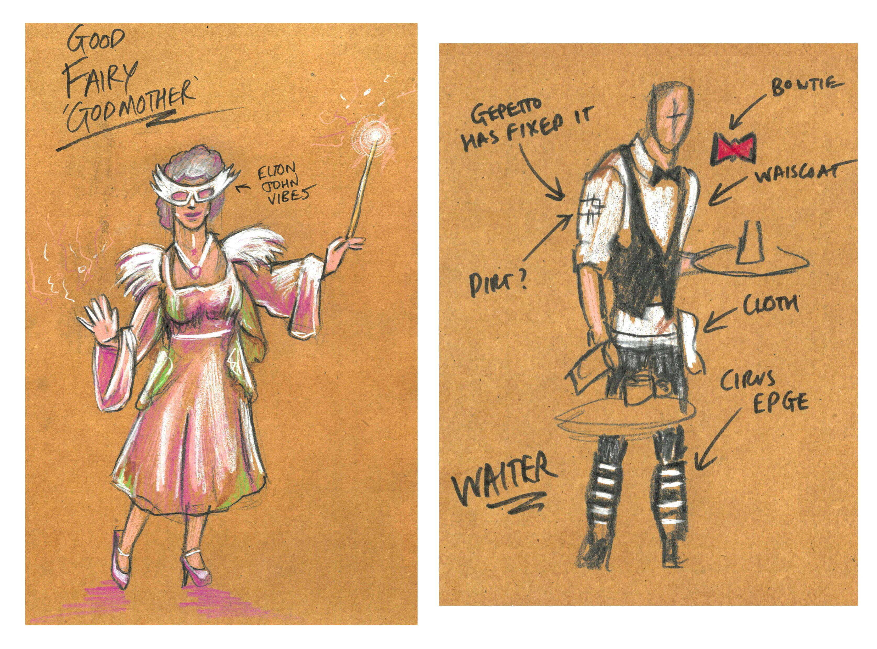 It’s been an absolute whirlwind set and costume designing this fantastically ambitious, playful and brilliant production. The vision was to make as much of the set, costume and puppetry from found and recycled material as possible, much as Gepetto does in the story where he forages wood in the Cherry woods, and to celebrate the Watermill's unique atmosphere and environment.